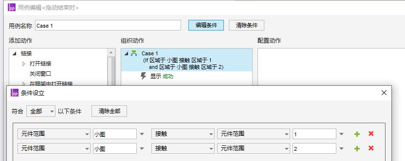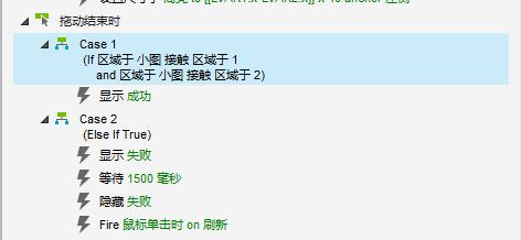 最后,需要添加【拖动结束时】的交互事件。即当【小图】移动到与热区1、热区2重叠的时候,显示验证成功。
