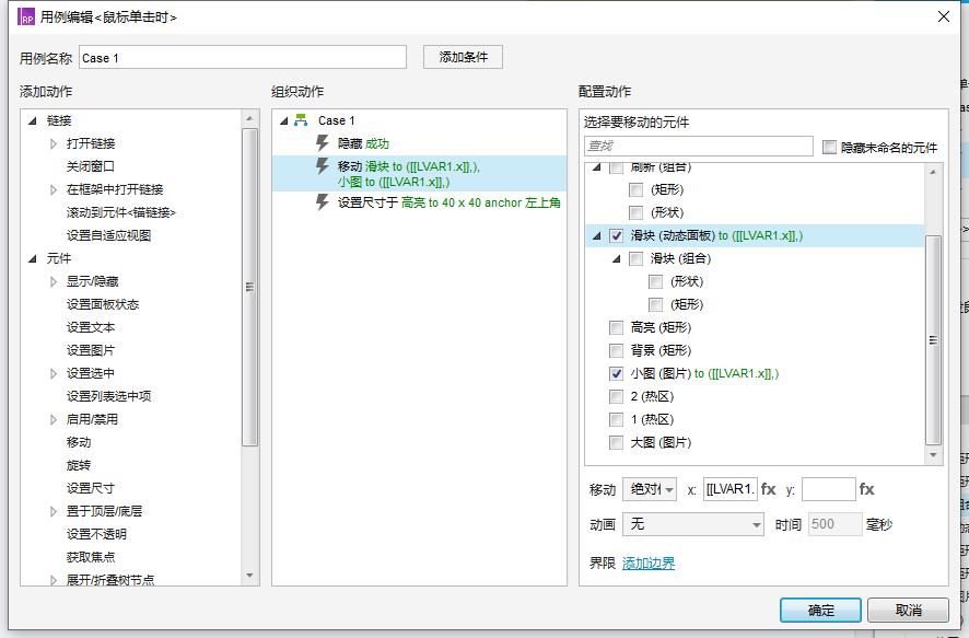 选中【刷新】按钮,添加【鼠标单击时】交互事件,隐藏【成功】矩形。移动【滑块】和【小图】到绝对位置,X轴设置为[[LVAR1.x]],其中LVAR1.x为【背景】的的X轴坐标值。同时,设置矩形【高亮】的尺寸为40*40,锚点为左边。