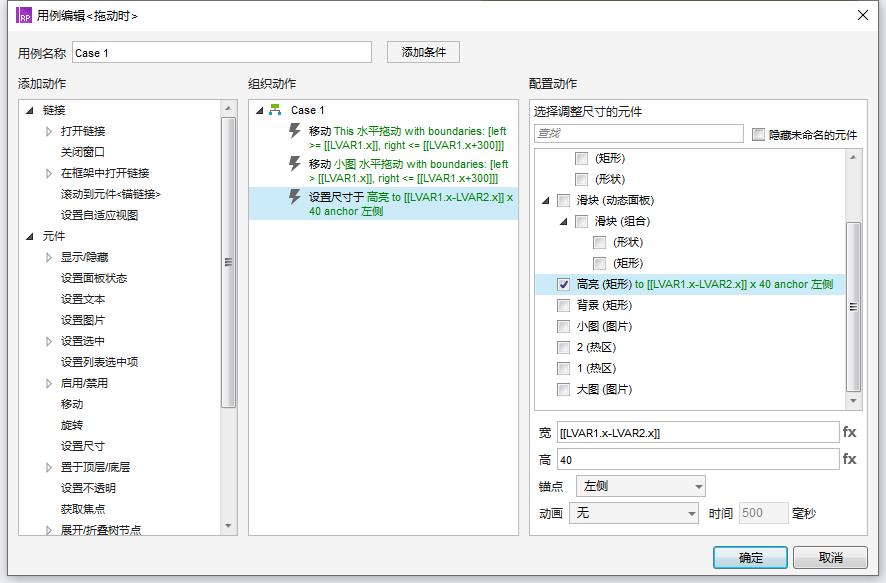 其次,增加【滑块】移动时,【高亮】条的尺寸跟着变化。设置【高亮】矩形的宽度为:[[LVAR1.x-LVAR2.x]],其中,LVAR1.x为【滑块】的X轴坐标值,LVAR2.x为【背景】的X轴坐标值。