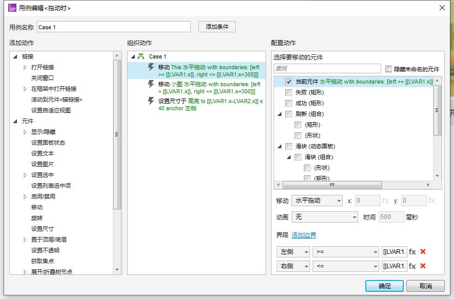 (1)选中动态面板【滑块】,添加【拖动时】交互事件,勾选【当前元件】,设置为:水平移动,添加左右边界。